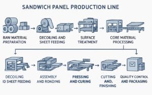 uncoiling and film covering, precision roll forming, automated cutting, preheating, high-pressure foam application, double-belt conveying, controlled heating, and final panel cutting.